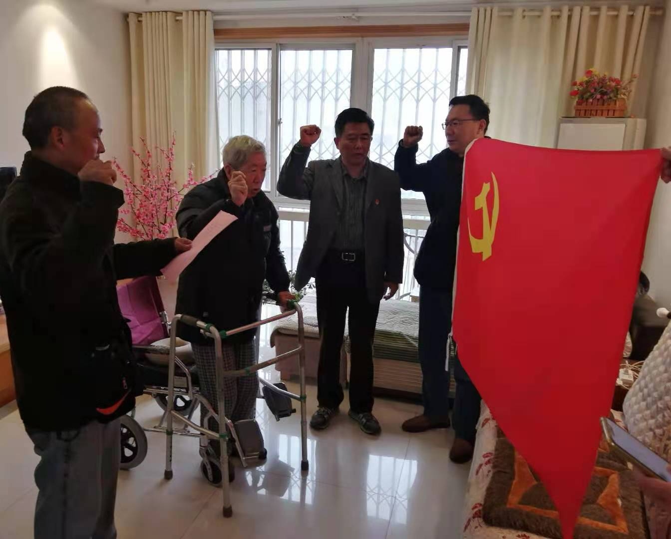 “我志愿加入中國共產(chǎn)黨,擁護黨的綱領(lǐng),遵守黨的章程,履行黨員義務,執(zhí)行黨的決定,嚴守黨的紀律,保守黨的秘密,對黨忠誠,積極工作,為共產(chǎn)主義奮斗終身,隨時準備為黨和人民犧牲一切,永不叛黨?!?2歲高齡的離休干部王健清同志在安徽電影集團第三黨支部書記帶領(lǐng)下,認真宣讀入黨誓詞。