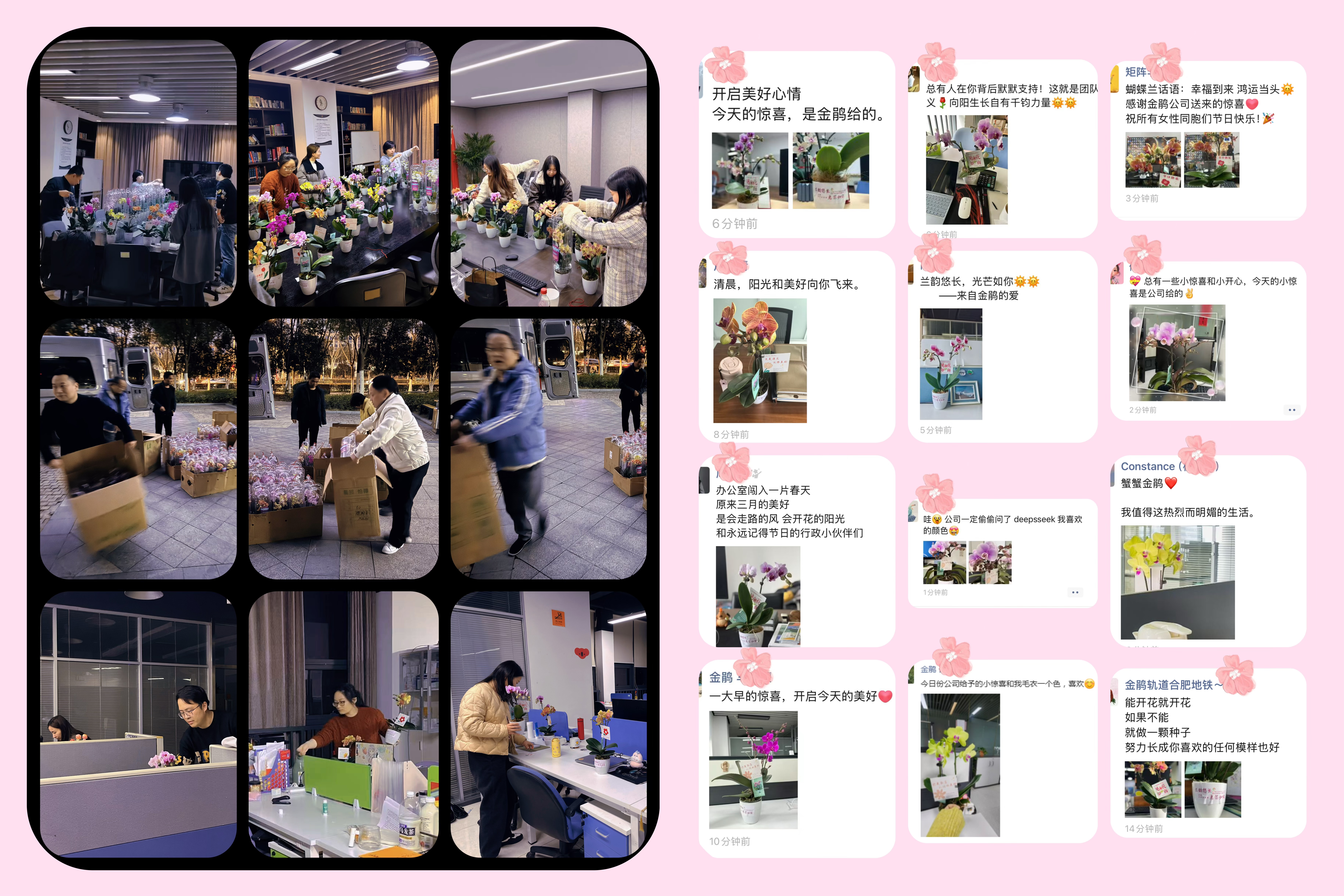 3月6日夜晚,當(dāng)公司大樓逐漸安靜下來,職能部門的同事們卻依然忙碌著。他們穿梭在各個(gè)辦公室,在每位女職工的桌上精心擺放了一盆蝴蝶蘭。這些蝴蝶蘭姿態(tài)優(yōu)雅,花瓣如蝴蝶般翩翩起舞,散發(fā)著淡淡的清香,仿佛訴說著對(duì)女職工們的美好祝愿。每盆花上都附著一張精致的祝??ㄆ厦嬗脺剀暗淖煮w寫著:“蘭韻悠長(zhǎng),光芒如你——金鵑因你而美麗”。蓄謀的浪漫化成了破曉的驚喜,3月7日一上班,金鵑的辦公室里充滿了歡聲笑語。