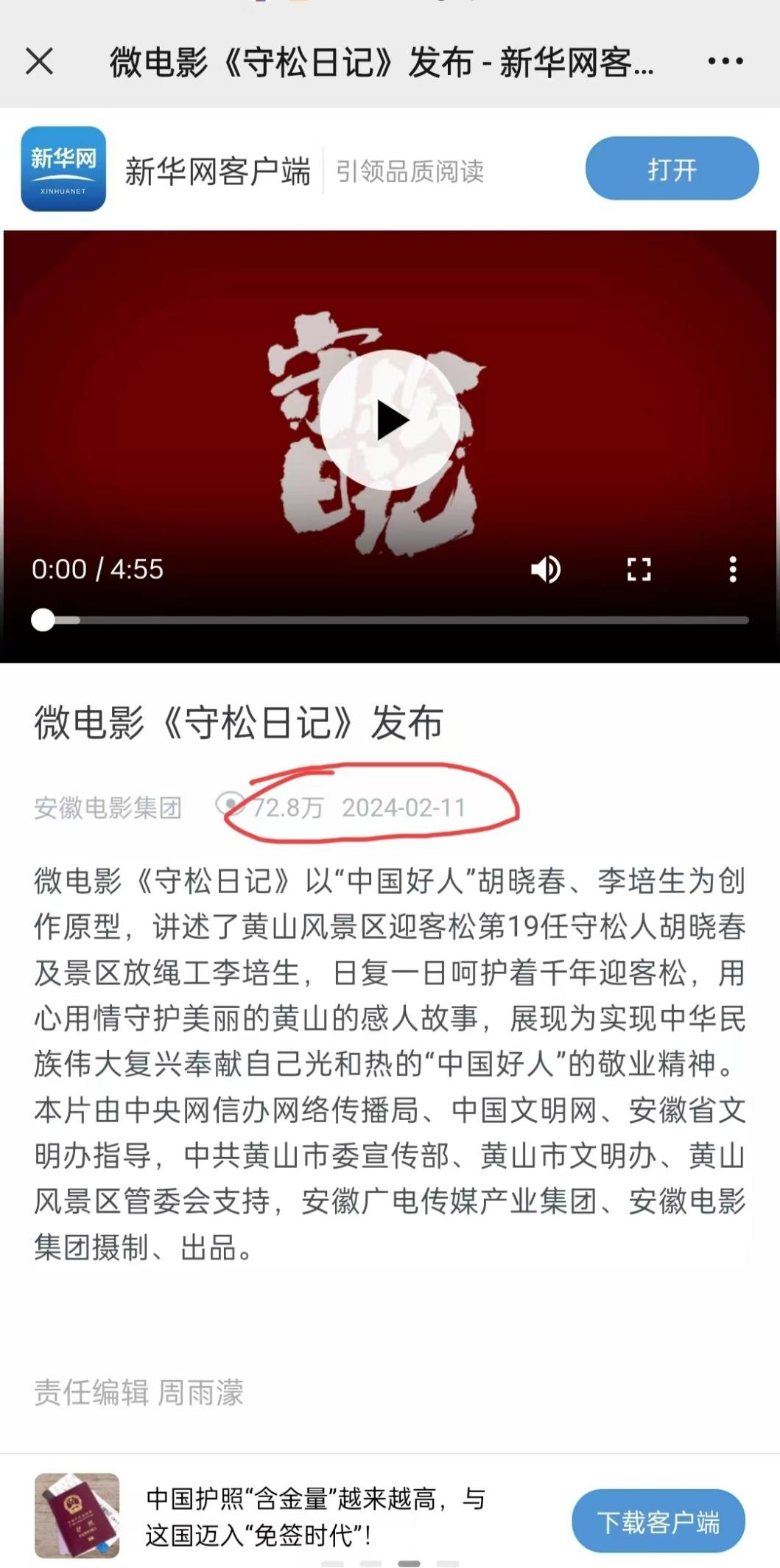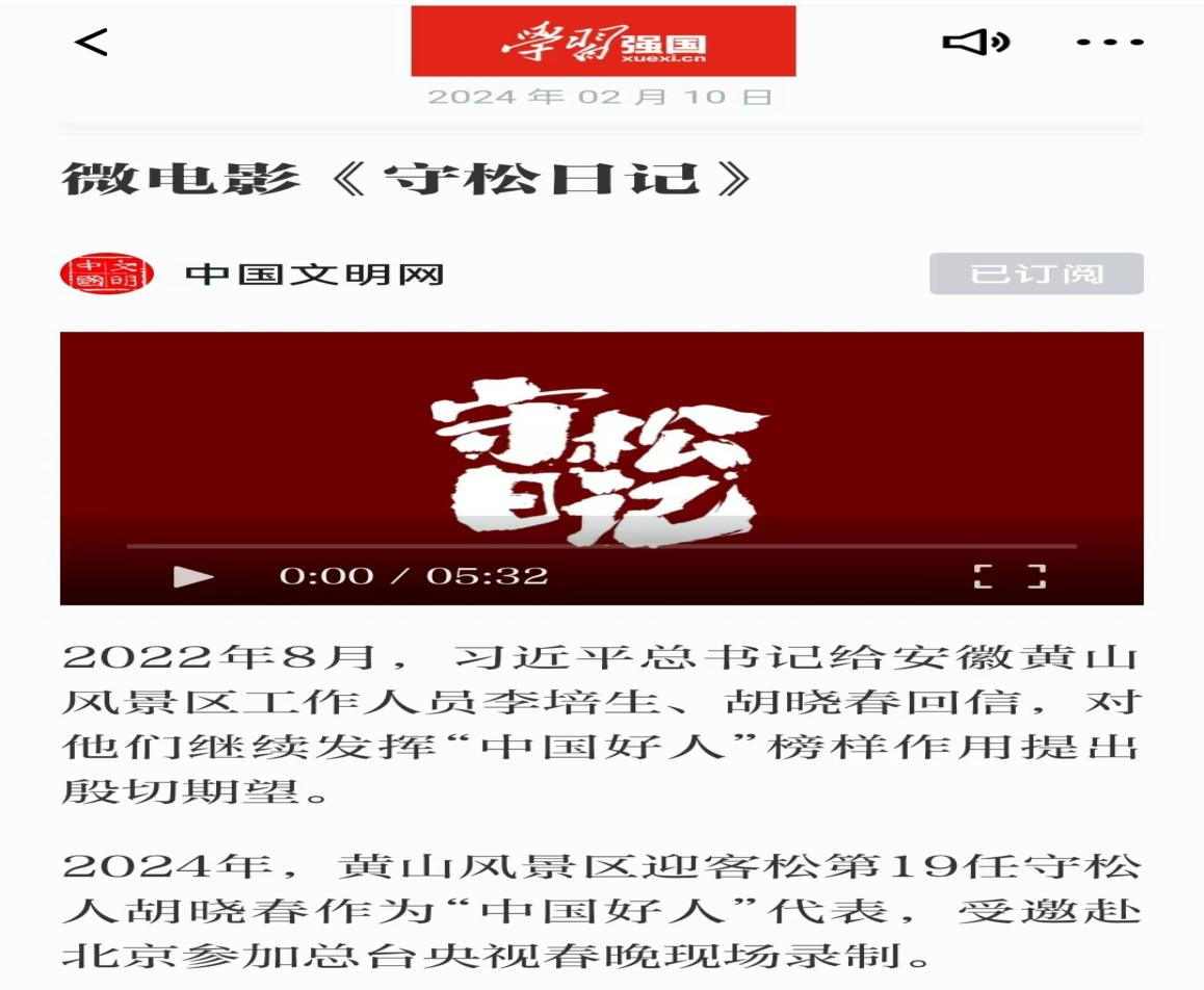 黃山風景區(qū)迎客松第19任守松人胡曉春和景區(qū)放繩工李培生,是習近平總書記2022年8月13日給予回信的“中國好人”。在胡曉春代表“中國好人”群體登上今年央視春晚受到全國關注、廣泛好評之際,由安徽電影集團以其為原型創(chuàng)作的微電影《守松日記》,于2月10日大年初一在中國文明網PC端、強國號、微信、微博、微視平臺首發(fā)上線。該微電影以演員演繹和原型出鏡相結合的形式,真情講述黃山守松人日復一日呵護千年迎客松的感人故事,充分體現了“中國好人”在平凡工作中創(chuàng)造不平凡業(yè)績的敬業(yè)精神,生動形象地傳遞了向上向善正能量。