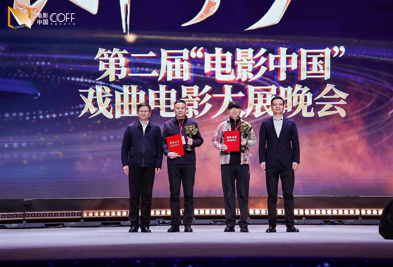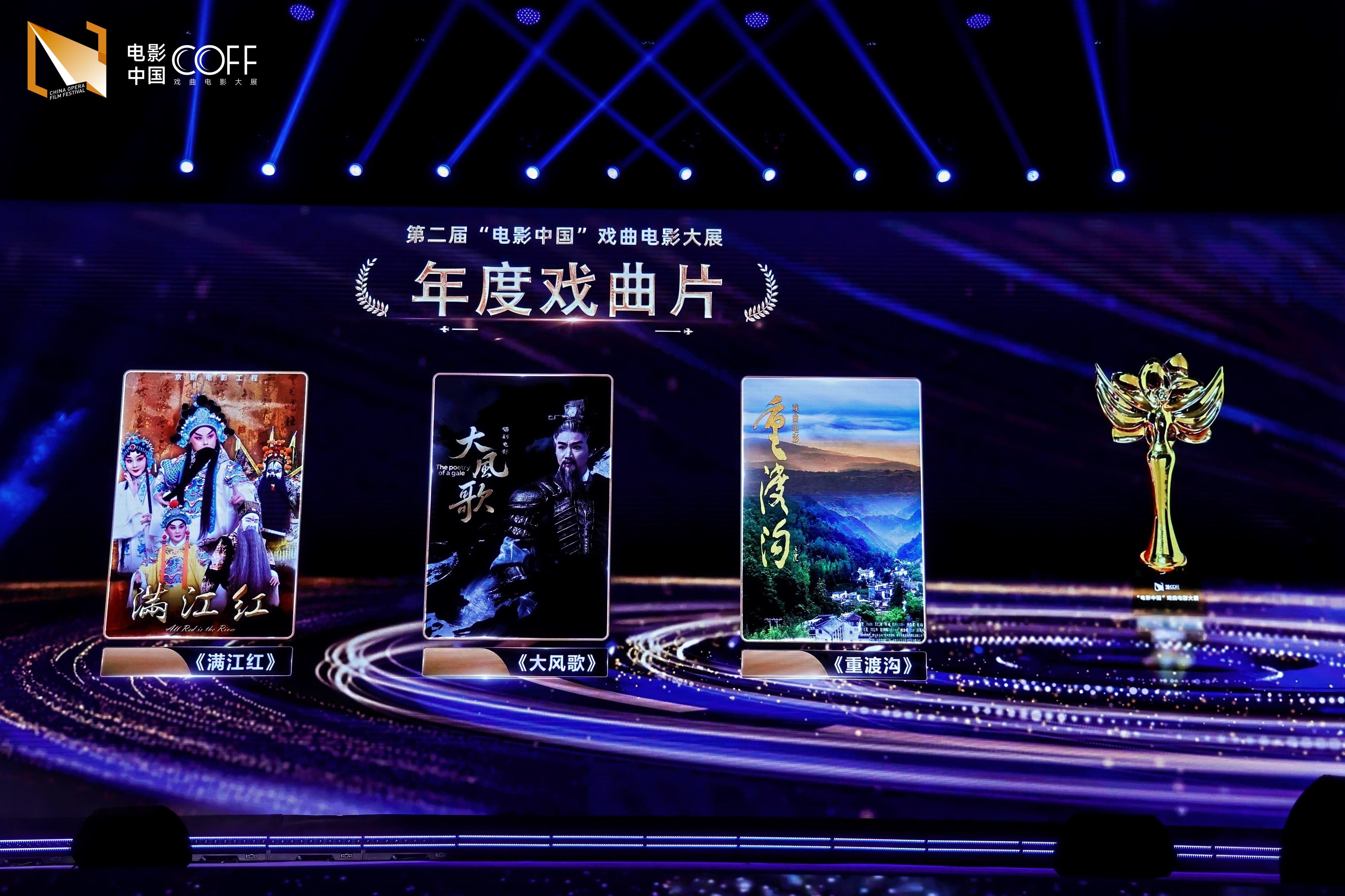 晚會現(xiàn)場名家薈萃,多項榮譽揭曉。京劇電影《滿江紅》、錫劇電影《大風歌》、豫劇電影《重渡溝》榮獲“年度戲曲片”;表演藝術家于魁智憑借在《滿江紅》中成功塑造岳飛形象獲“中國戲曲電影突出貢獻特別榮譽”;《雙蝶扇》《東吳郡主》等6部作品獲“評委會特別榮譽”;《百年程派》《奔向幸?!返?部影片獲“年度戲曲片提名”;《上岸》《南西廂》等10部作品獲“年度戲曲短片”獎;另有7部作品獲年度導演、年度編劇、年度男女主角、年度美術、年度剪輯、年度攝影等單項獎,24部作品獲“優(yōu)秀戲曲影片”獎。