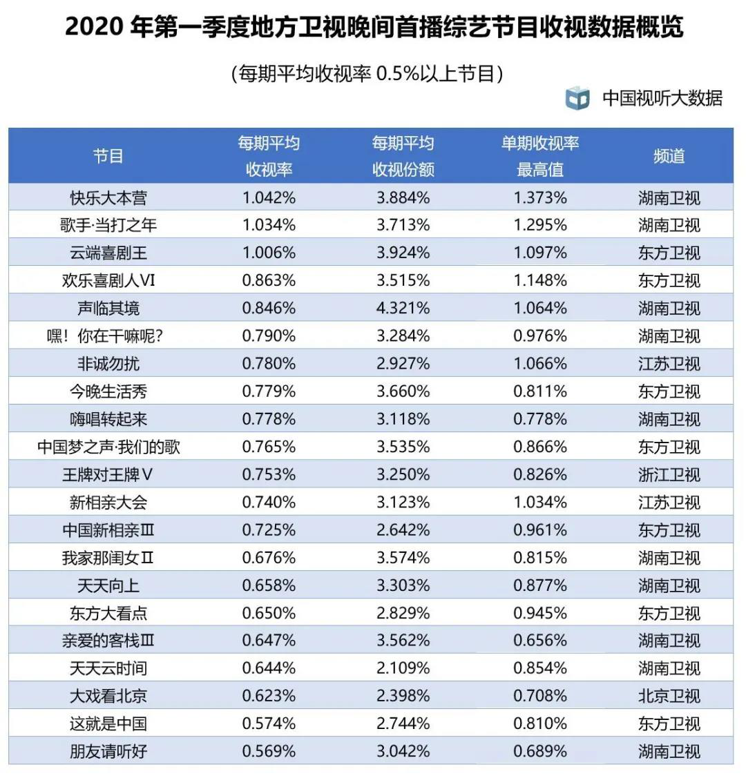 一季度,各頻道迅速應(yīng)對疫情,創(chuàng)新節(jié)目錄制模式,積極滿足群眾居家防疫精神文化需要。地方衛(wèi)視綜藝方面,《快樂大本營》《歌手·當(dāng)打之年》《云端喜劇王》《歡樂喜劇人Ⅵ》《聲臨其境》《非誠勿擾》《新相親大會》單期收視率超過1%,21檔綜藝節(jié)目每期平均收視率超過0.5%。