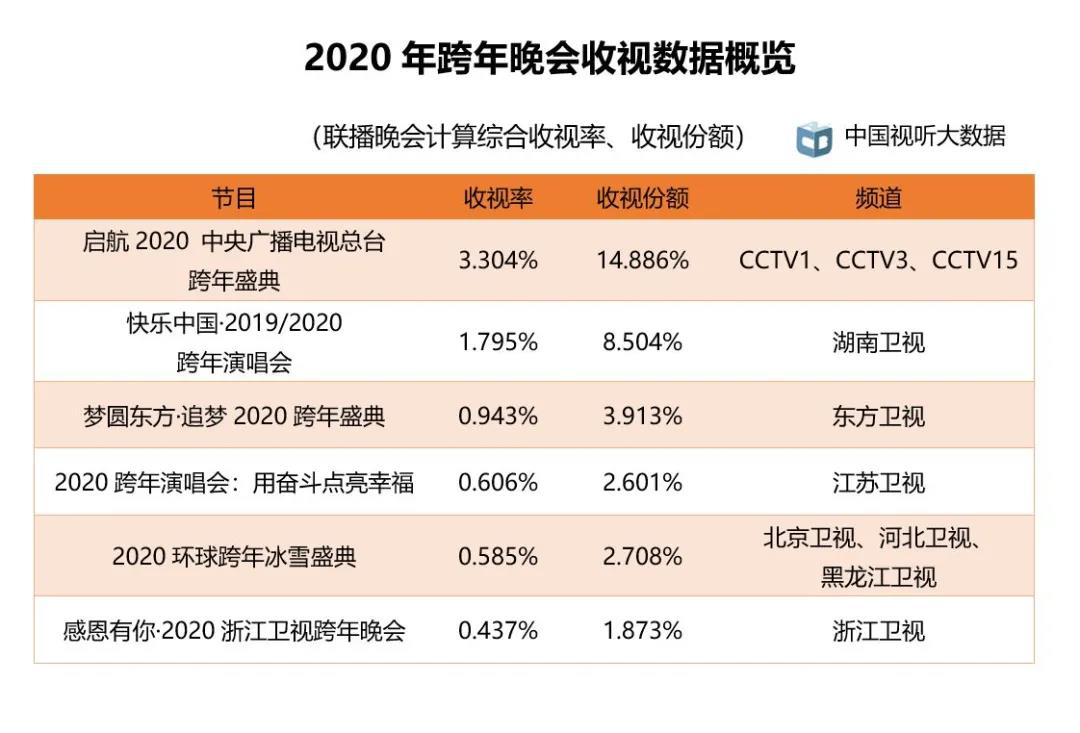 2019年12月31日晚,中央廣播電視總臺和地方衛(wèi)視頻道為觀眾獻(xiàn)上了6場主題鮮明的跨年晚會,頗受觀眾喜愛,獲得了可喜的收視成績。中央廣播電視總臺《啟航2020中央廣播電視總臺跨年盛典》綜合收視率3.304%,收視份額14.886%;地方衛(wèi)視5場跨年晚會收視位列當(dāng)日地方衛(wèi)視同時段開播所有節(jié)目前5,湖南衛(wèi)視以“快樂中國”為主題的跨年晚會收獲1.795%的高收視率,收視份額達(dá)8.504%。