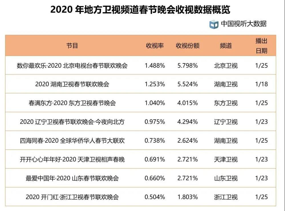 在這場抗擊新冠肺炎疫情的戰(zhàn)斗中,全國人民響應(yīng)黨中央號召,居家不外出,春節(jié)期間晚會節(jié)目成為居家生活的調(diào)味品。1月24日晚中央廣播電視總臺以“共圓小康夢,歡樂過大年”為主題的春節(jié)聯(lián)歡晚會綜合收視率達(dá)20.631%,收視份額70.557%。地方衛(wèi)視春晚中,北京衛(wèi)視、湖南衛(wèi)視、東方衛(wèi)視贏得春晚收視前三甲,收視率均超過1%。