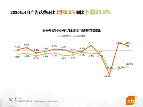 新冠疫情還未結(jié)束,但隨著全面復(fù)工復(fù)產(chǎn)的有序進行,其對廣告市場的影響在逐漸減少。根據(jù)CTR媒介智訊的數(shù)據(jù)顯示,2020年4月廣告市場整體刊例花費環(huán)比繼續(xù)提升,達到8.9%,同比降幅也有所收窄,為-29.8%。