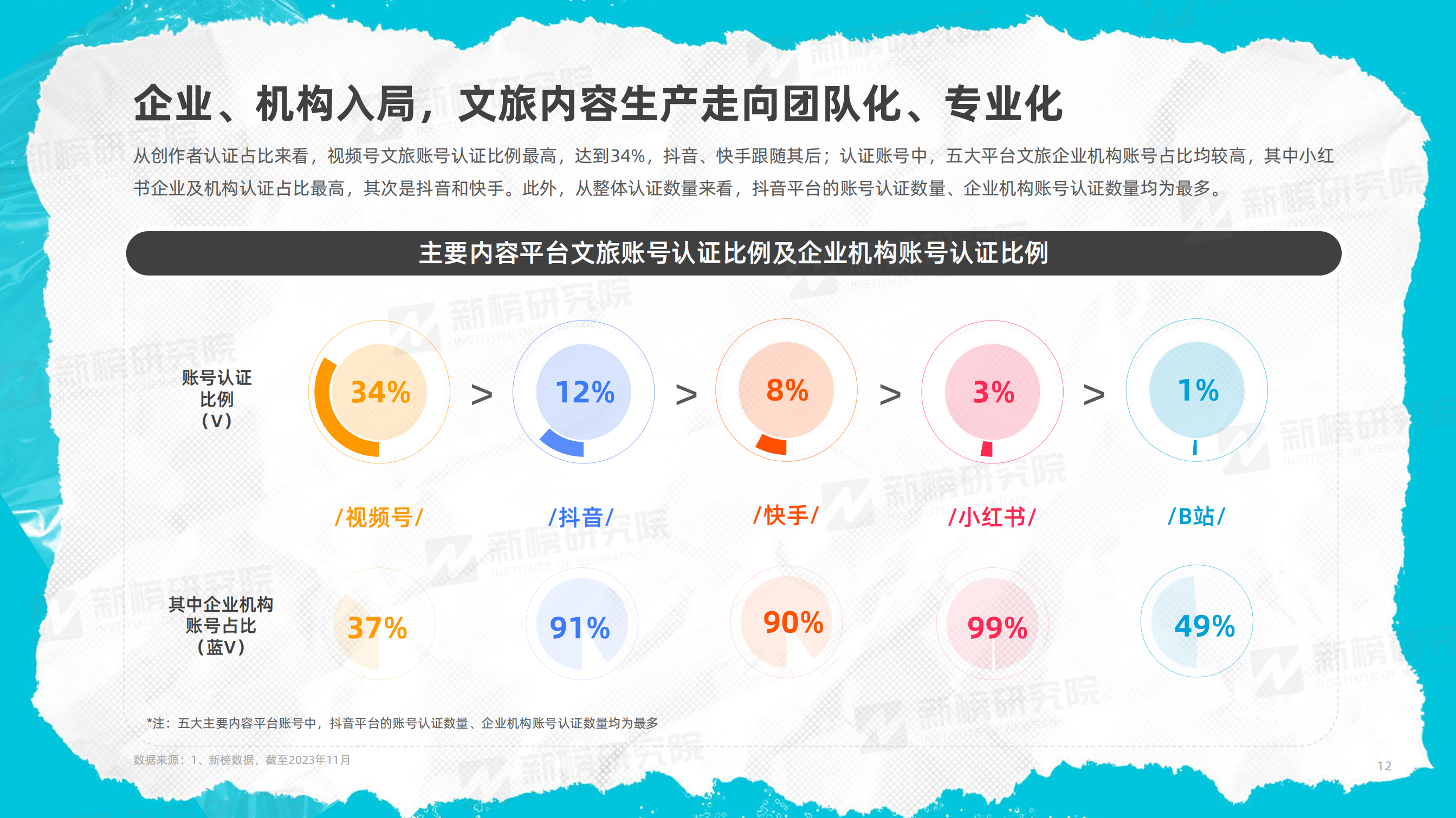 從創(chuàng)作者認證占比來看,視頻號文旅賬號認證比例最高,達到34%,抖音、快手跟隨其后;認證賬號中,小紅書企業(yè)及機構認證占比最高,其次是抖音和快手。