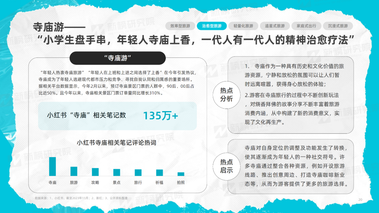“年輕人熱衷寺廟旅游”“年輕人在上班和上進之間選擇了上香”在今年引發(fā)熱議,小紅書“寺廟”相關筆記數(shù)超135萬篇,寺廟成為了年輕人逃避現(xiàn)代都市壓力和競爭、尋找自我認同和歸屬感的重要場所。
