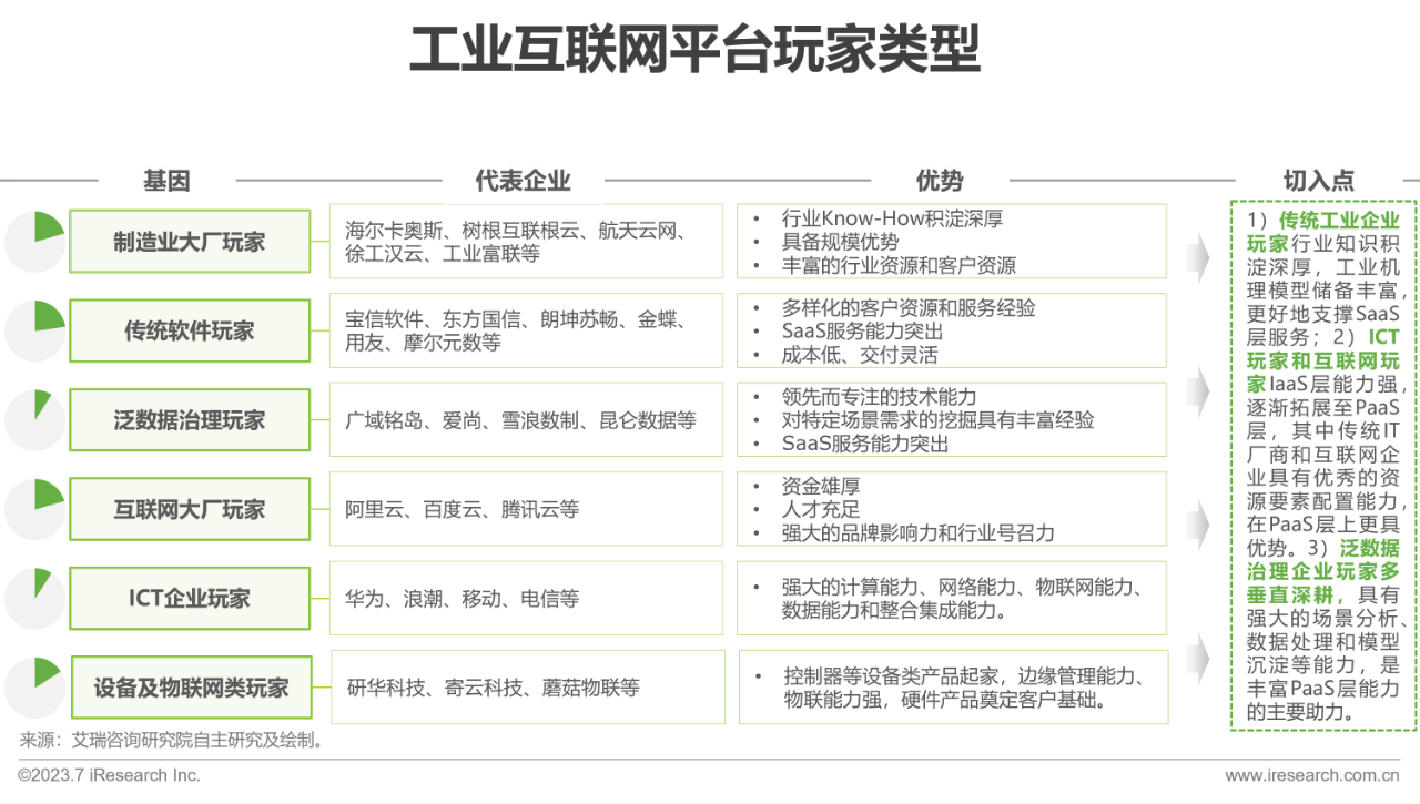 由于中國工業(yè)互聯(lián)網(wǎng)平臺市場目前仍處于初步發(fā)展期,供給方仍然以規(guī)模性的大企業(yè)為主,這些企業(yè)技術底蘊較深、服務經(jīng)驗豐富、資金雄厚且具有一定行業(yè)影響力。占據(jù)主要市場份額的玩家中,可以根據(jù)企業(yè)基因類型分為制造業(yè)大廠玩家、傳統(tǒng)軟件玩家、互聯(lián)網(wǎng)大廠玩家、ICT企業(yè)玩家(包含傳統(tǒng)IT廠商和電信運營商)、泛數(shù)據(jù)治理玩家和設備及物聯(lián)網(wǎng)類玩家六類。不同基因給玩家?guī)淼膬?yōu)勢和路徑各不相同,如制造業(yè)大廠,一方面,行業(yè)know-how理解深,行業(yè)經(jīng)驗相對容易沉淀為機理模型;另一方面,企業(yè)本身就是需求方,產品及服務可能更容易滿足需求方的需求屬性;ICT和互聯(lián)網(wǎng)企業(yè)玩家基礎設施底座能力強;泛數(shù)據(jù)治理企業(yè)垂直深耕能力強,是PaaS層的主要構成者。