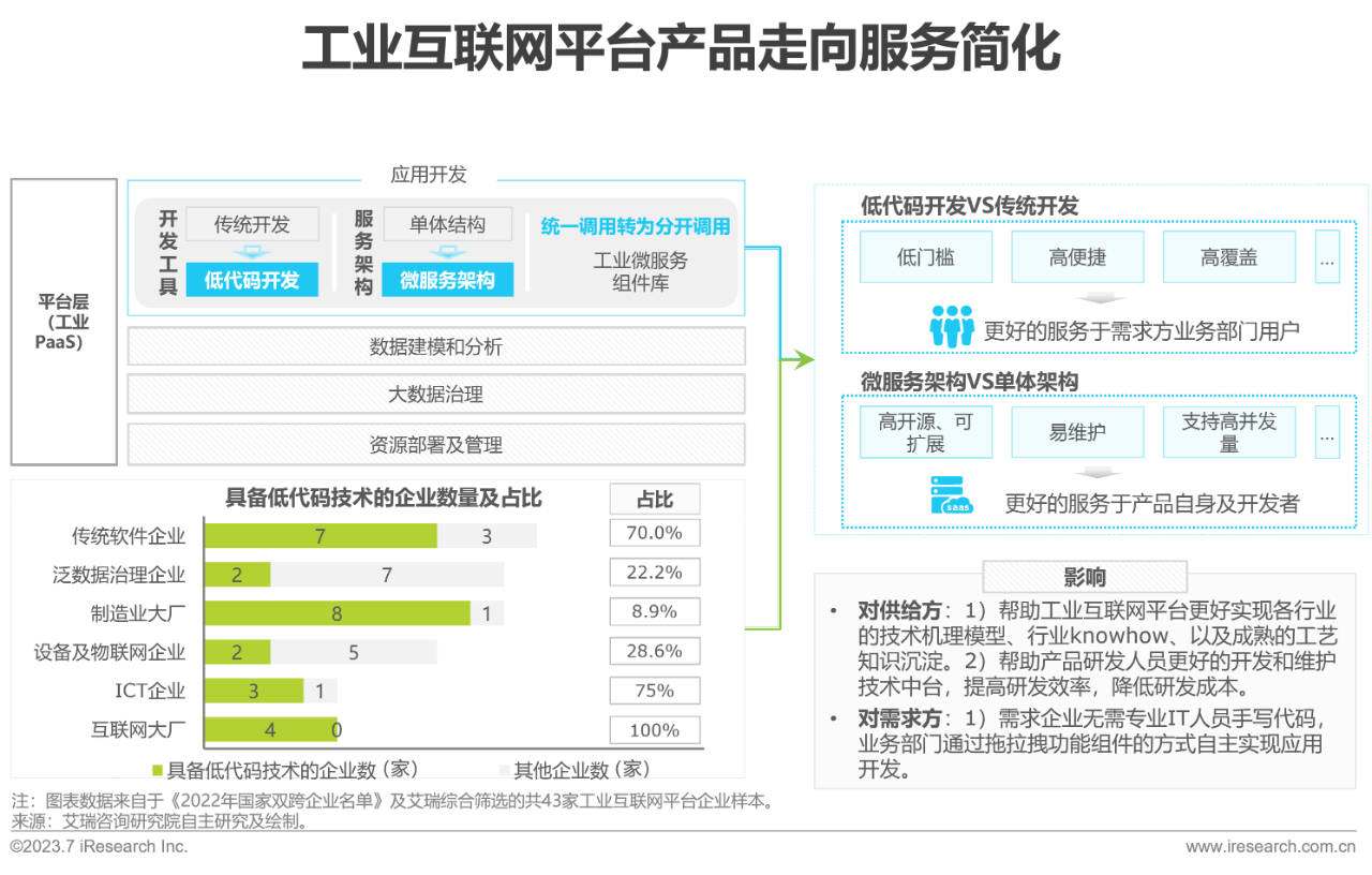 平臺由單體架構走向微服務架構、傳統(tǒng)代碼開發(fā)走向低代碼開發(fā),應用開發(fā)模式逐漸走向低門檻、高開源、高便捷,平臺產品的服務形式相對簡化,主要好處有兩點:1)加強產品架構的可擴展性和易維護性;2)擴大開發(fā)者覆蓋范圍。以上兩點,對供需企業(yè)雙方都有裨益:對供給方,實現(xiàn)工業(yè)機理高效地沉淀和調用的同時,還有利于研發(fā)人員更好地優(yōu)化開發(fā)和維護;對需求方,能幫助懂生產制造等核心環(huán)節(jié)但無編程經(jīng)驗的業(yè)務人員實現(xiàn)自主開發(fā),實現(xiàn)需求方的高效應用及管理。