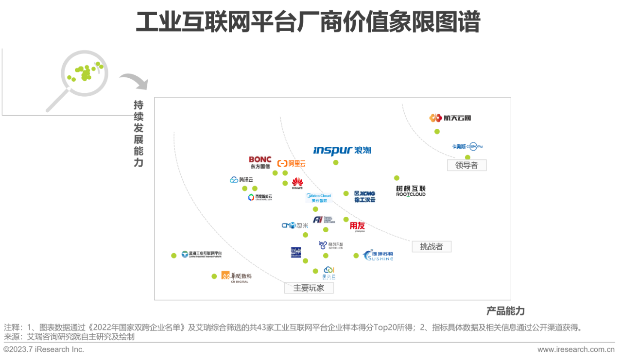整個工業(yè)互聯(lián)網(wǎng)平臺玩家類型多樣、玩家背景也較為復雜,各家企業(yè)都依托自身基因或背景優(yōu)勢占據(jù)一定的市場。本報告從產品能力和持續(xù)發(fā)展能力兩個維度出發(fā),篩選了前20名的企業(yè),他們主要具有如下2個特點:1)各玩家無論在產品和服務能力、渠道關系、品牌綜合影響力等方面,各家均有所長,故整體而言玩家差異并不大,尚未形成絕對的頭部企業(yè),你追我趕之勢明顯;2)政府關系緊密、通過政府合作拓展區(qū)域影響力、市場發(fā)聲頻繁等是現(xiàn)階段相對領先的企業(yè)的主要競爭手段。
