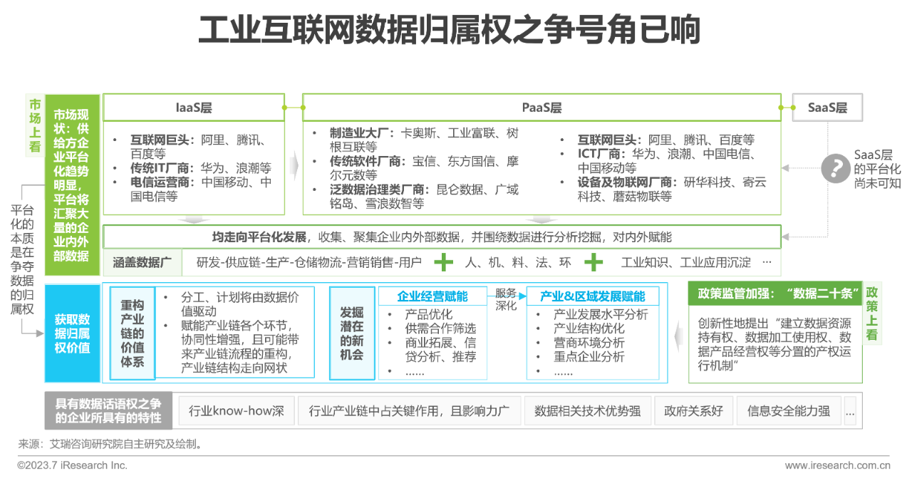 當前,各工業(yè)互聯(lián)網(wǎng)供給方均有向平臺化方向發(fā)展的趨勢,這一趨勢表面是企業(yè)服務能力的同質化與綜合化,但本質上是供給方對客戶數(shù)據(jù)“歸屬權”的爭奪。獲得數(shù)據(jù)歸屬權的益處主要有兩點:其一,數(shù)據(jù)作為新的生產力有望促進產業(yè)價值鏈的重構與新的分工,供給方容易在這種分工中為客戶提供新的服務價值;其二,通過對數(shù)據(jù)資產的挖掘,短期看有助于為企業(yè)經(jīng)營賦能,長期看, 隨著數(shù)據(jù)資產的積累與行業(yè)上下游的打通,可逐步拓展至為產業(yè)&區(qū)域發(fā)展服務,賦能當?shù)禺a業(yè)發(fā)展,為供給方帶來第二增長曲線。