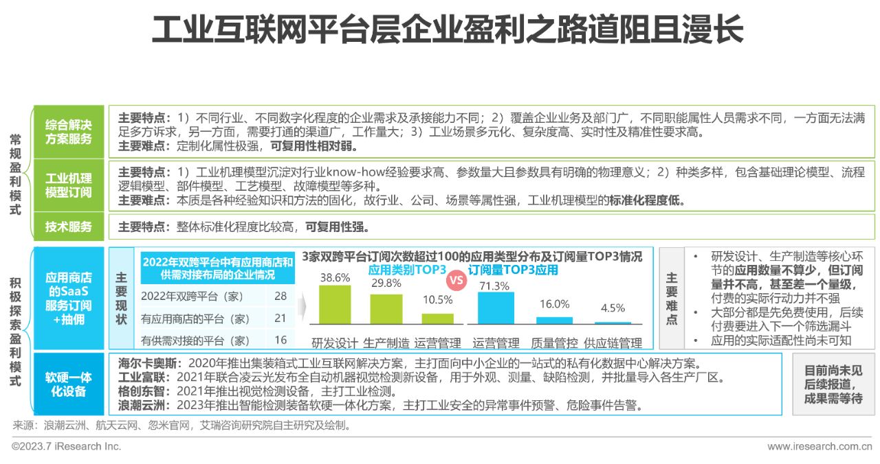 當前工業(yè)互聯(lián)網(wǎng)市場大多是“賠錢賺吆喝”,新的變現(xiàn)模式正在不斷探索。但就目前而言,盈利變現(xiàn)依然道阻且艱。除去常規(guī)的綜合解決方案等盈利模式外,目前平臺分發(fā)抽傭+軟硬一體化設備兩大類模式為企業(yè)所積極探索。針對分發(fā)抽傭,目前呈現(xiàn)對平臺的生態(tài)貢獻可能遠高于盈利貢獻的特點,其主要原因是研發(fā)設計、生產制造等核心環(huán)節(jié)本身的復雜性太高、企業(yè)差異性太強,應用的適配性不高。據(jù)不完全統(tǒng)計,在訂閱次數(shù)超過100的應用中,研發(fā)設計、生產制造的應用數(shù)量占據(jù)TOP2,占比達68.4%,但就訂閱總數(shù)而言,運營管理呈絕對優(yōu)勢,占比達71.3%,這也說明用戶更趨向于為解決實際需求付費。針對軟硬一體化,目前依然處于探索期,早前有報道,但現(xiàn)階段尚未看到后續(xù)報道,究竟是折戟沉沙,還是即將大獲全勝,我們拭目以待。