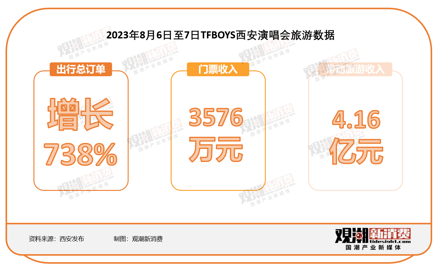 2023年8月6日晚,TFBOYS“十年之約”演唱會(huì)在西安奧體中心體育場(chǎng)舉辦,門票收入3576萬元。據(jù)第三方抽樣調(diào)查統(tǒng)計(jì),本場(chǎng)演出前后,西安住宿線上提前預(yù)訂量同比大幅增長,8月6日-7日出行總訂單量同比增長738%;直接帶動(dòng)4.16億元的旅游收入。