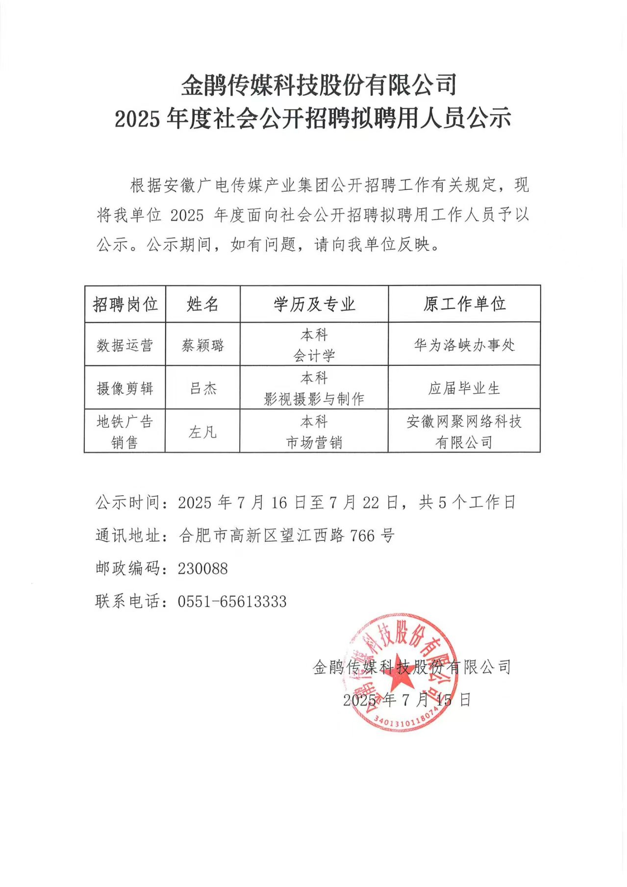 金鵑傳媒科技股份有限公司2025年度社會公開招聘擬聘用人員公示