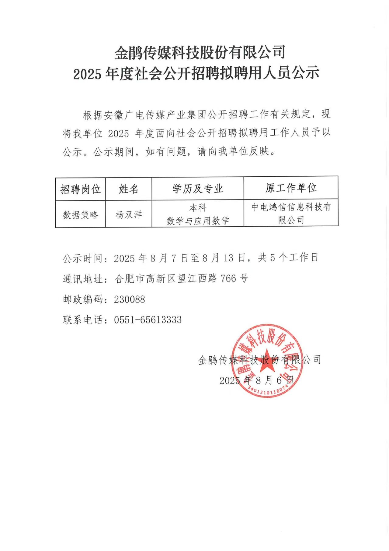 金鵑傳媒科技股份有限公司2025年度社會公開招聘擬聘用人員公示